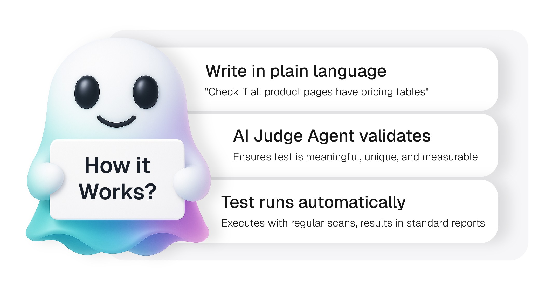 Every brand has unique standards. Define custom tests in plain language and let our AI Judge Agent validate and run them automatically.